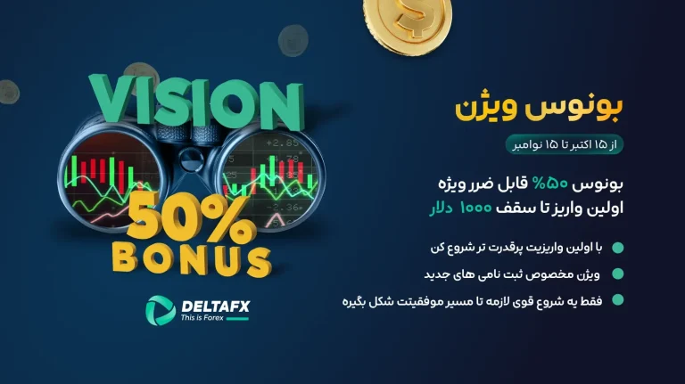 آینده‌ی معامله را ببین! با بونوس ویژن دلتا اف‌ایکس، کاربران جدید می‌توانند مسیر خود را با اعتماد بیشتری آغاز کنند. از ۵۰٪ بونوس قابل ضرر تا سقف ۱۰۰۰ دلار در اولین واریز خود بهره‌مند شوید و با قدرت و دیدی روشن‌تر معامله کنید. این فرصت ویژه از ۱۵ اکتبر تا ۱۵ نوامبر ۲۰۲۵ در دسترس است — اولین واریز خود را به یک شروع قدرتمند تبدیل کنید!